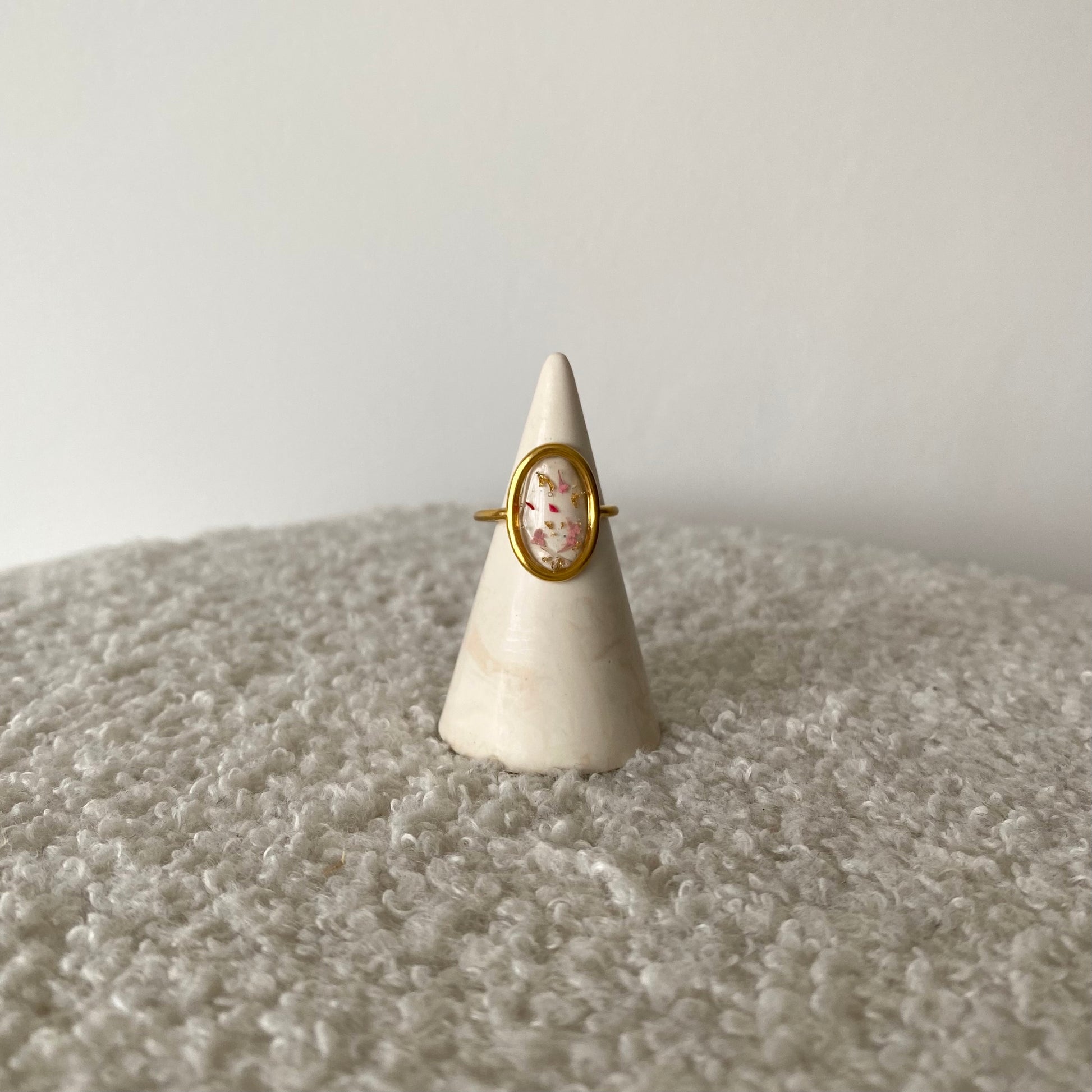 Cette bague dorée présente un cabochon ovale en résine renfermant de délicates fleurs, créant un bijou lumineux au charme poétique et moderne.