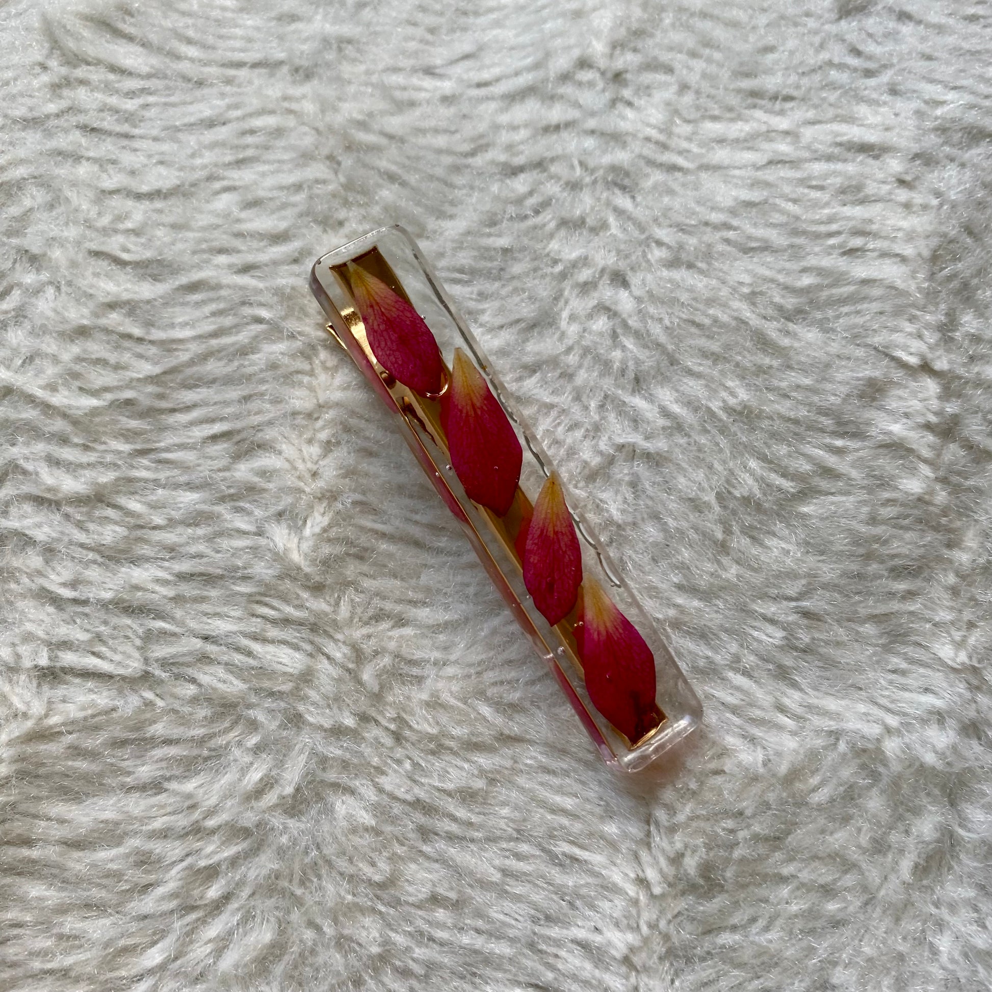 Les barrettes sont composées de fleurs séchées naturelles, soigneusement déposées une à une. La barrette métallique, quant à elle, est de couleur or.