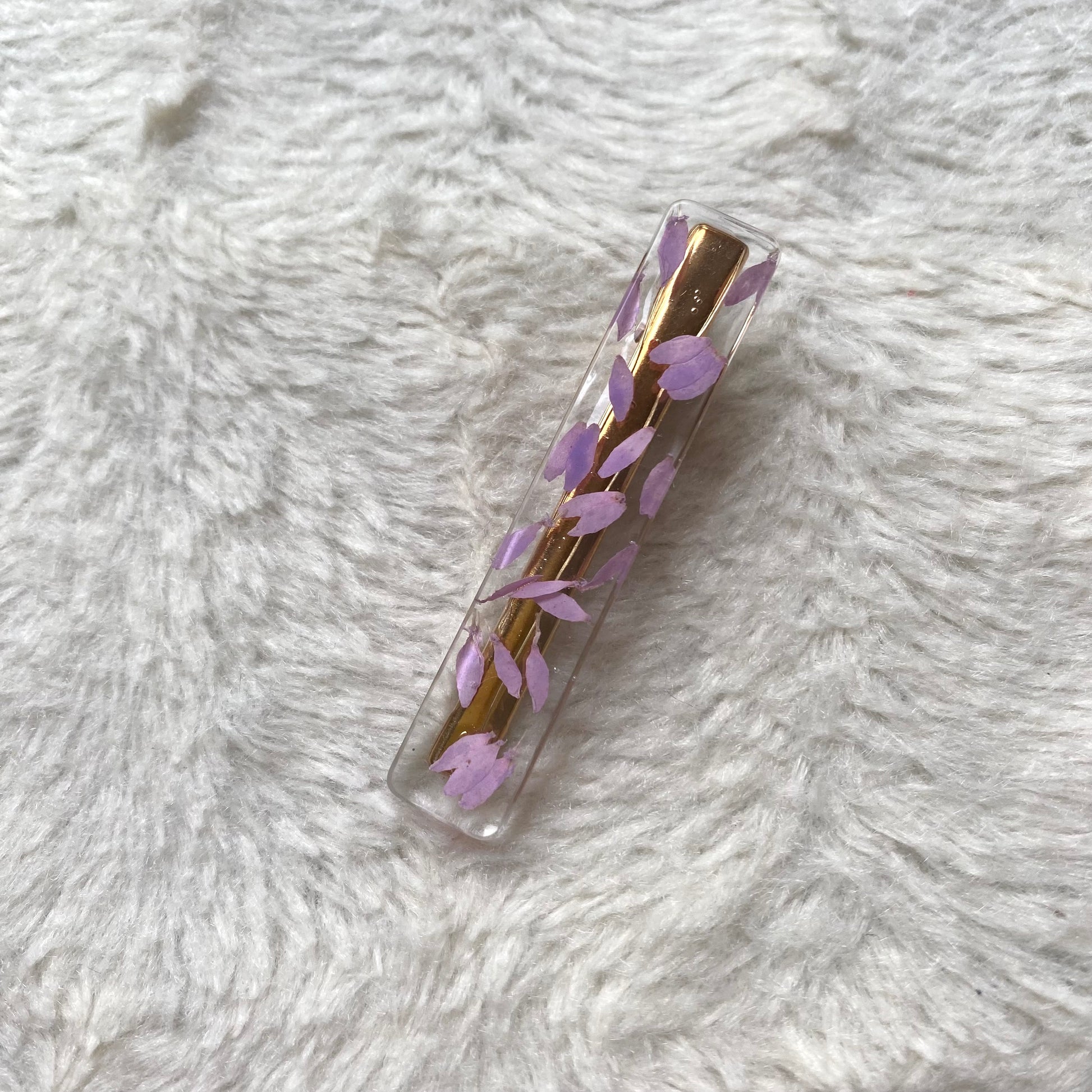 Les barrettes sont composées de fleurs séchées naturelles, soigneusement déposées une à une. La barrette métallique, quant à elle, est de couleur or.