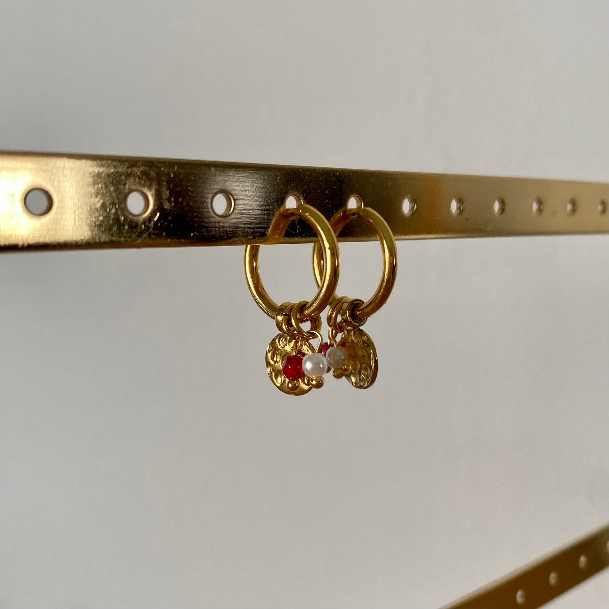 Apportez une touche d’élégance et de douceur à votre style avec ces superbes boucles d’oreilles. Composées de petites créoles dorées agrémentées de perles rouges et blanches.